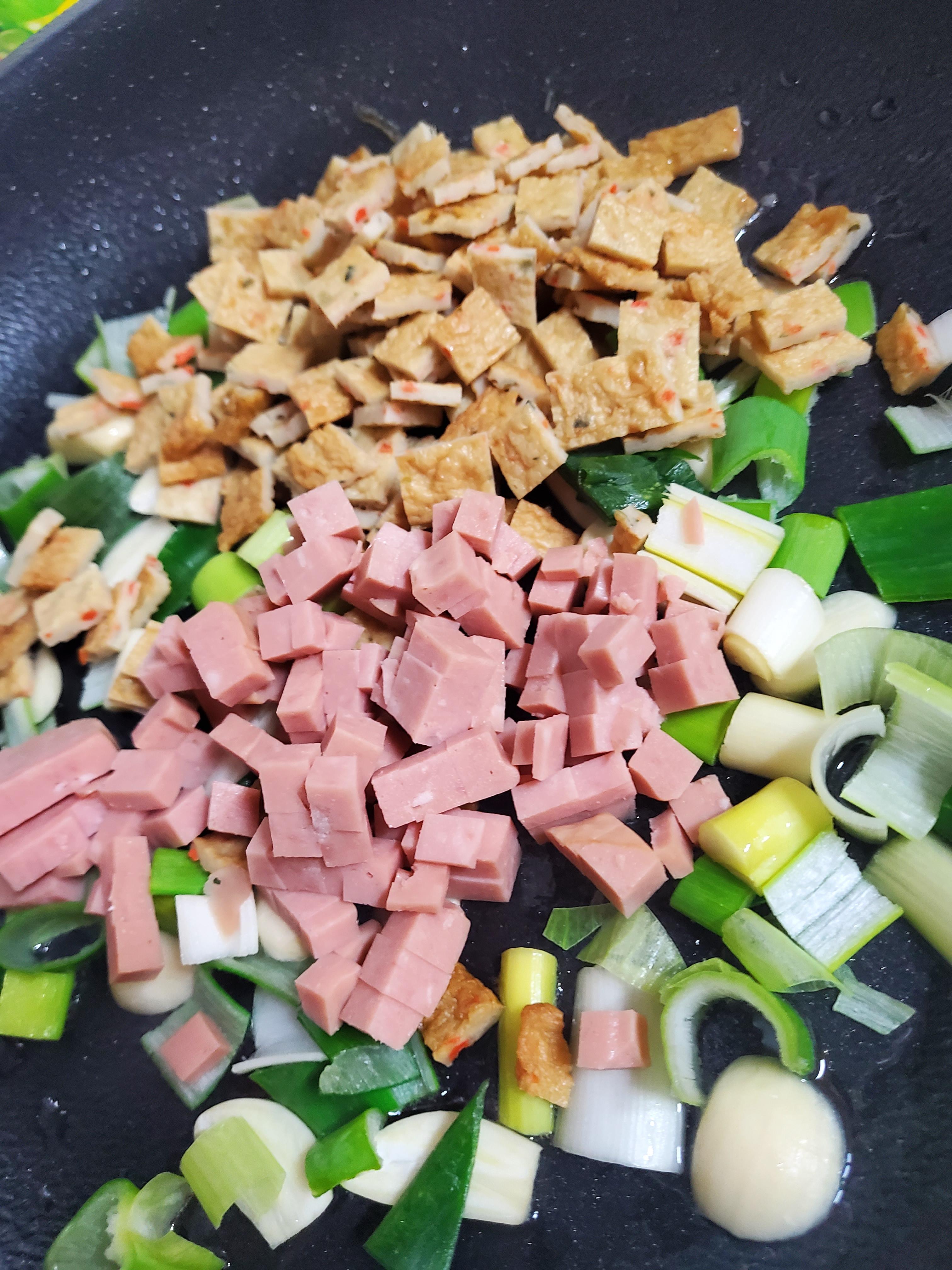 오뎅과 스팸도 잘게 썰어 투입 볶습니다.